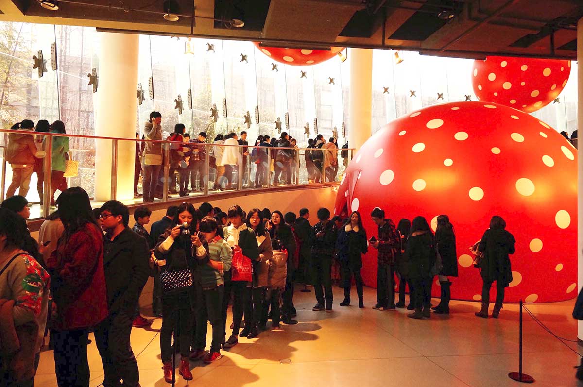 大批观众在上海当代艺术馆排队参观展览“草间弥生——我的一个梦”
