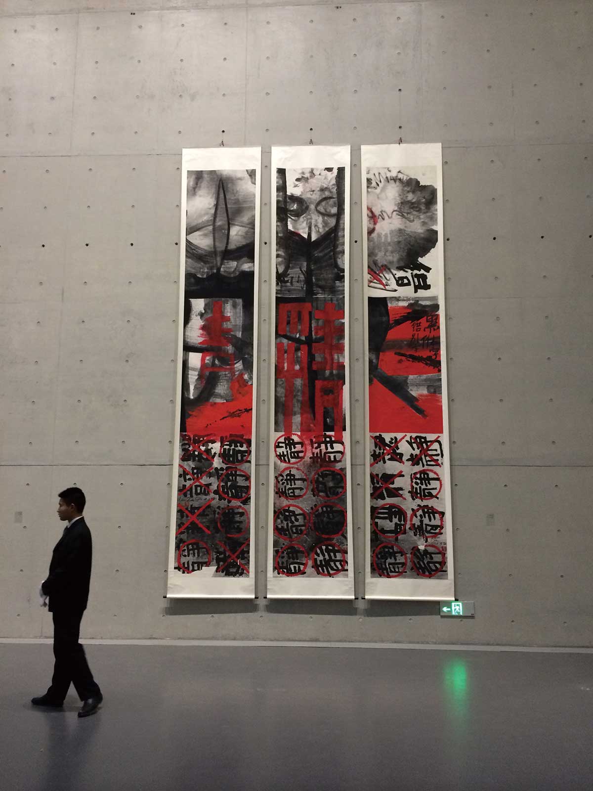 龙美术馆西岸馆开幕展“开今•借古”现场。谷文达《两种文化形态杂交的戏剧性B1-B3》,纸本水墨,1986年作