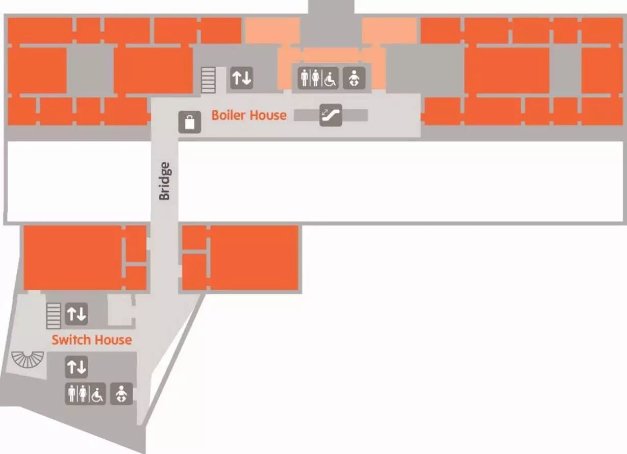 泰特现代美术馆的三个部分互相清晰区分开来:被称为“开关室”的新建筑,被称为“锅炉房”(Boiler House)的2000年兴建的一批展馆,以及“三巨头”的最后一员“涡轮大厅”(The Turbine Hall)。从2000年建成起,“锅炉房”就一直展出从1900年到2016年之间的艺术品,而“开关室”的展品则从1960年开始说起。