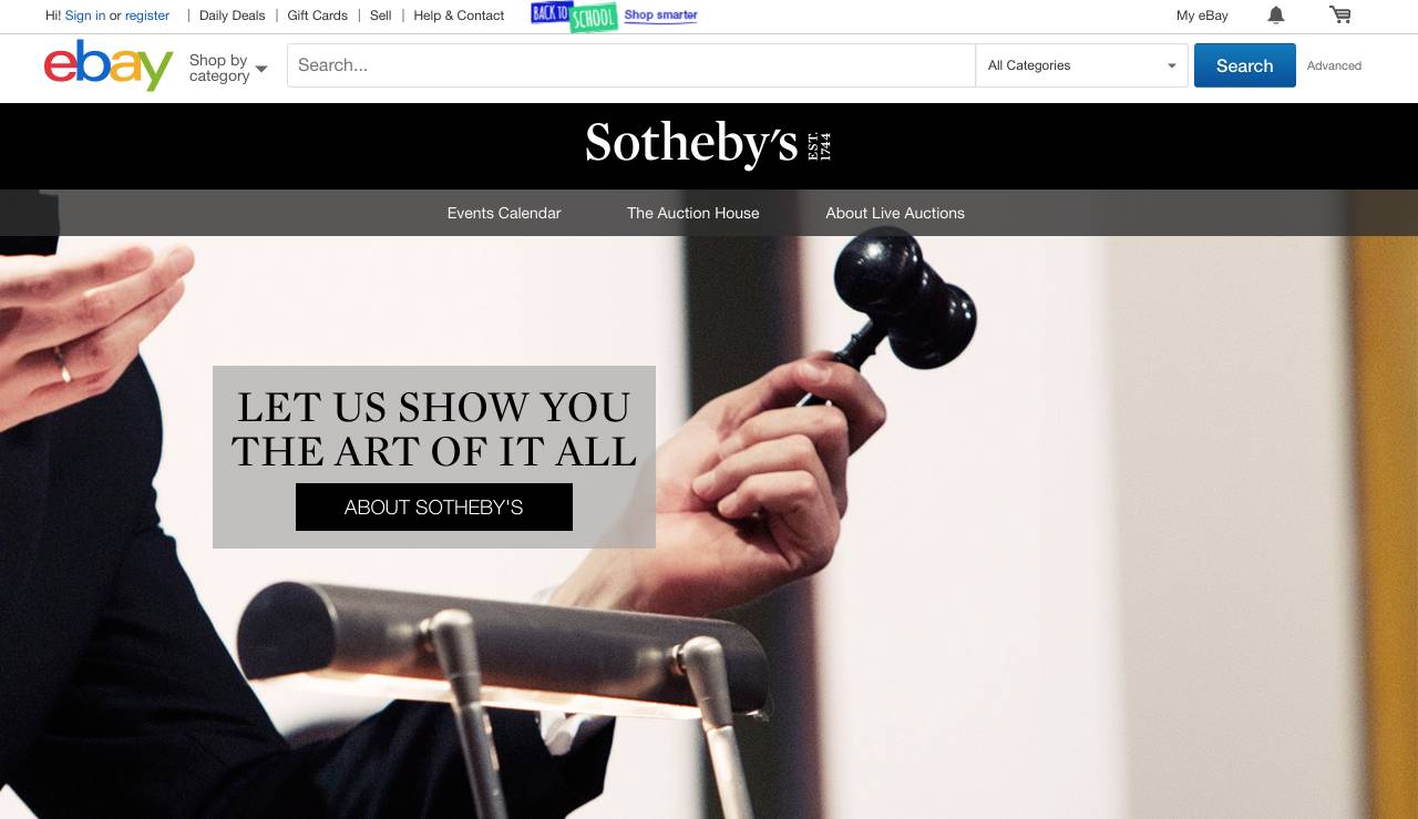 不同于佳士得努力建设属于自己的网络拍卖平台,今年5月苏富比拍卖行与eBay的合作进行了两场线上拍卖,其中包含巴勃罗·毕加索(Pablo Picasso)、安迪·沃霍尔(Andy Warhol)和萨尔瓦多·达利(Salvador Dalí)画作。苏富比与eBay的合作开始于2014年7月,目的是将市场扩展到一批更年轻的中小型收藏商。而eBay的大量用户群也对苏富比的这一目标提供支持:在2016年,其活跃用户已经达到1.62亿人次,比起去年同期增长了4%。