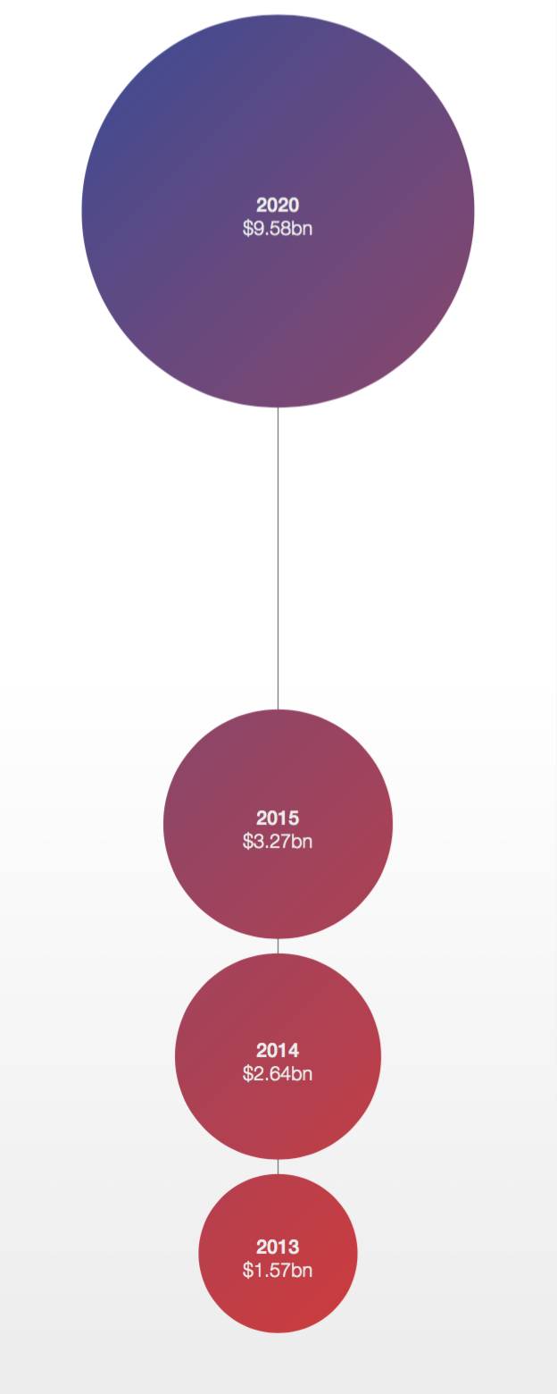 ▲ Hiscox所发布“线上艺术品拍卖市场年度报告”显示的过去几年内线上艺术市场总成交额与预测,从2013年的15.7亿美元(约合104.3亿人民币)增长到2015年的32.7亿美元(约合217.2亿人民币),并预测2020年线上艺术市场总成交额将会达到95.8亿美元(约合636.2亿人民币)