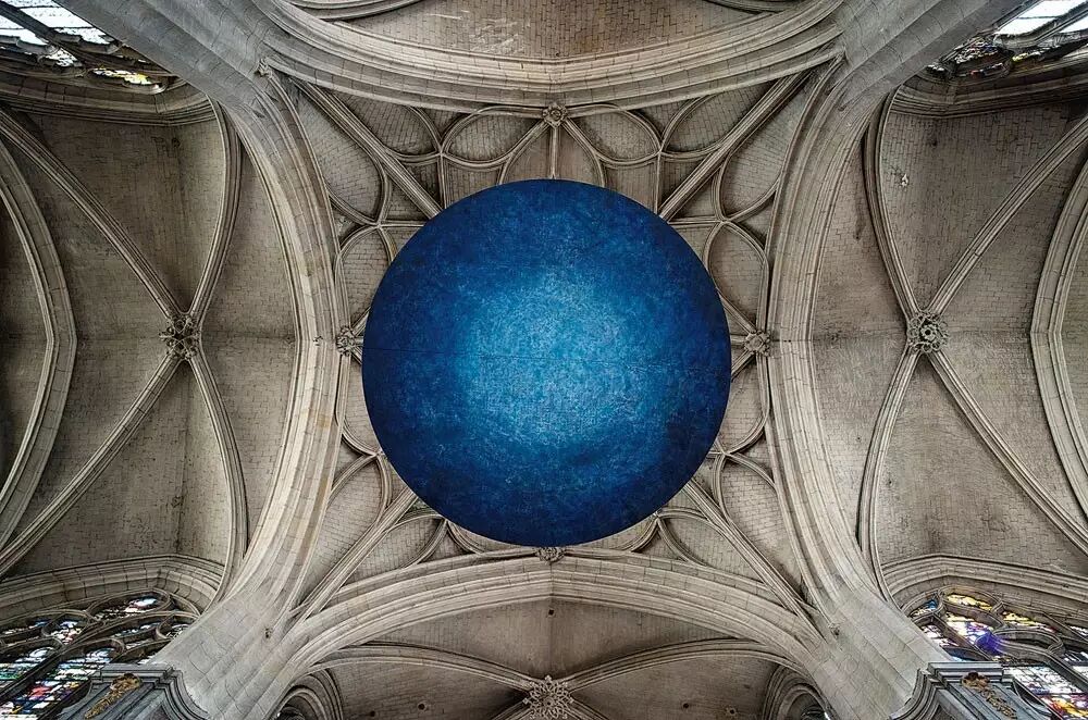 在巴黎的圣梅里教堂拱顶下出现了一件不平凡的艺术品。日本艺术家大舩真言(Makoto Ofune)用动物胶将矿物颜料黏在纸上形成一个巨大蓝球,并通过反射透过彩绘玻璃的光源点亮了圣梅里的拱顶。大舩真言的灵感来自于神道教传统。这个艺术品建立了古老与当代、东方与西方、神道教传统与天主教教堂之间的对话。
