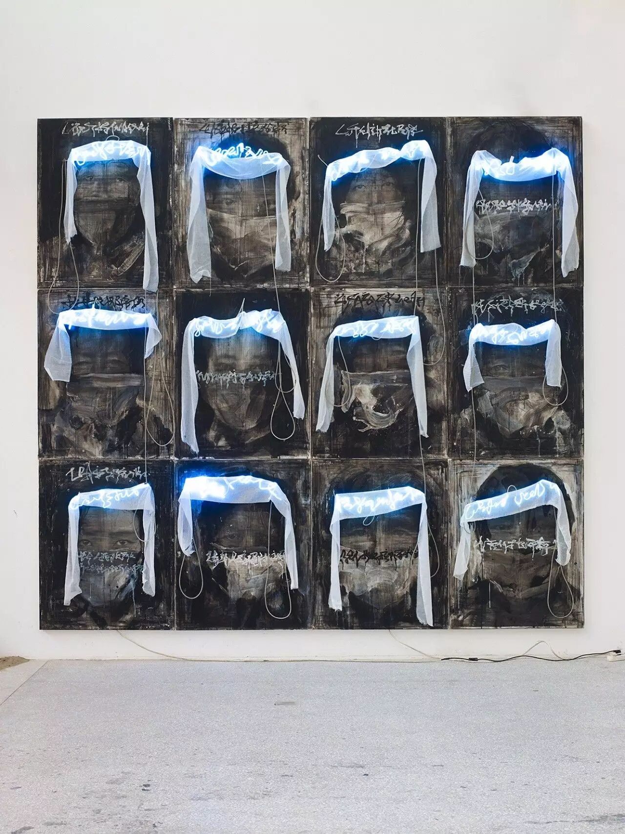 这种对有与无,开始与结束的探索几乎贯穿在整个展览中。走进“献曼达”展厅,占据整面墙体的大幅双联作品以黑白单色的肃静与强烈的对视碰撞着观者的心灵。这些肖像原是高波于上世纪90年代在西藏拍摄的《双重性肖像》系列作品,但在新的创作架构里,艺术家将肖像作品放大,将红色霓虹灯管十字型嵌入每一副肖像中间,易碎的被肢解的容颜与时光再一次体现其中。