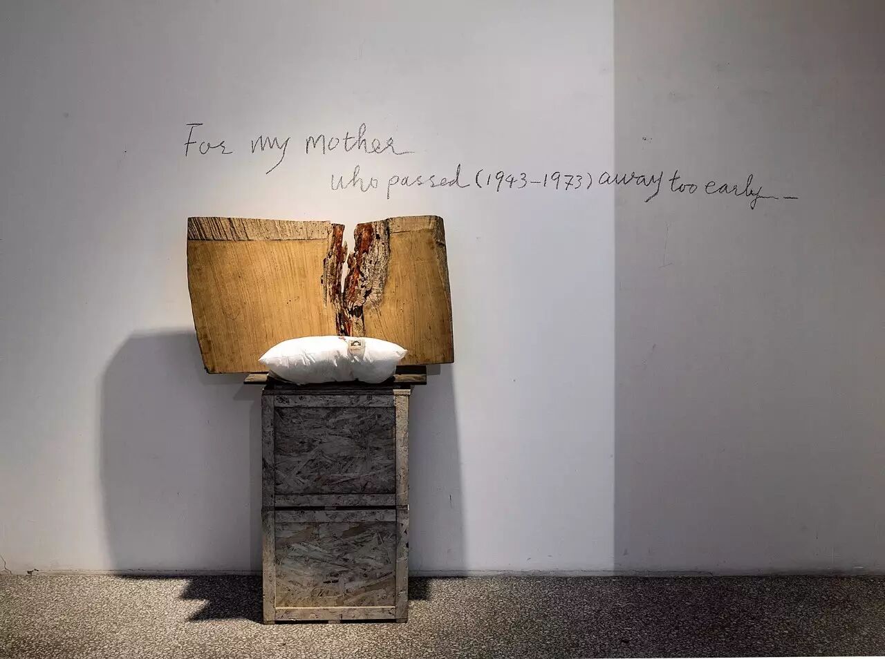 在“献给我的母亲”展厅中,我们在很容易被忽略的一个角落看到了《源》这个作品:这座由棉花、木头、血、照片组成的坟冢,便是为了祭奠高波儿时那一晴天霹雳情感撕裂的时刻,从墙上留下的句子中还能体会出高波创作时内心情绪的跌宕,他最开始写下:“我的母亲很早就离开了我们。”之后又把“很早”划去了,重新写成“我的母亲太早就离开了我们”。