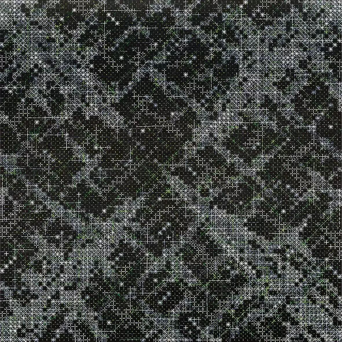 用数与几何的理性美来展现宗教观念里人对宇宙本体循环往复的执着探求,是极其内敛的一种向内求取能量的艺术表现手法。然而当下丁乙作品中的几何图示已经没有中心可寻。1999年至2011年这10多年的荧光色表现时期,原来丁乙画作中的超平面开始有了空间立体感和光感,透视感越来越强。荧光色的加入也带来更强烈的观感冲击。丁乙将对30年来老上海迅速膨胀后的都市体验,抽象地带进了他的作品。在抽象的画面中,大量的”十”和”X”重复复制,好像无数的信息流的汇聚分裂又具有规律的分布,隐喻了互联网时代我们被信息覆盖,新鲜又无聊的状态——将生活的一切故事情节和空间抽离。