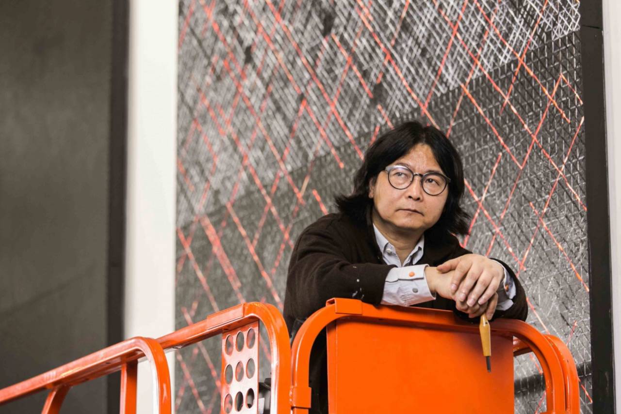 ▲ 丁乙与正在创作中的木板“十示”系列,图片来源:龙美术馆