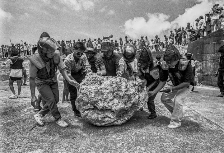 ▲ 1995年6月1日,兰花岛男子将巨大的石块推入大海,阻止核废料船进入港口。摄影师:黄子明,图片来源:台北市立美术馆