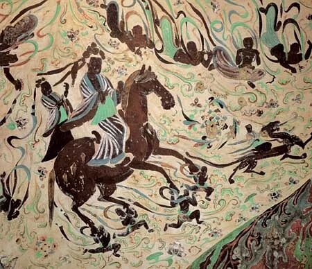 1941年5月,张大千又率三夫人杨宛君、次子张心智、门人子侄及随行家眷数十人,带着五百公斤的行李,从成都出发先抵达兰州前往青海塔尔寺参观,而后奔赴敦煌。途中车辆时常发生故障,又被迫改乘骆驼代步跋涉。战争期间西北地区民风彪悍,常有土匪出没,人心惶惶,在经历一个多月的长途跋涉,众人终于抵达敦煌。一到达目的地,张大千就迫不及待地提灯进入洞窟内部窥探究竟,精美的壁画让他立刻决定延长原本只有三个月的行程。