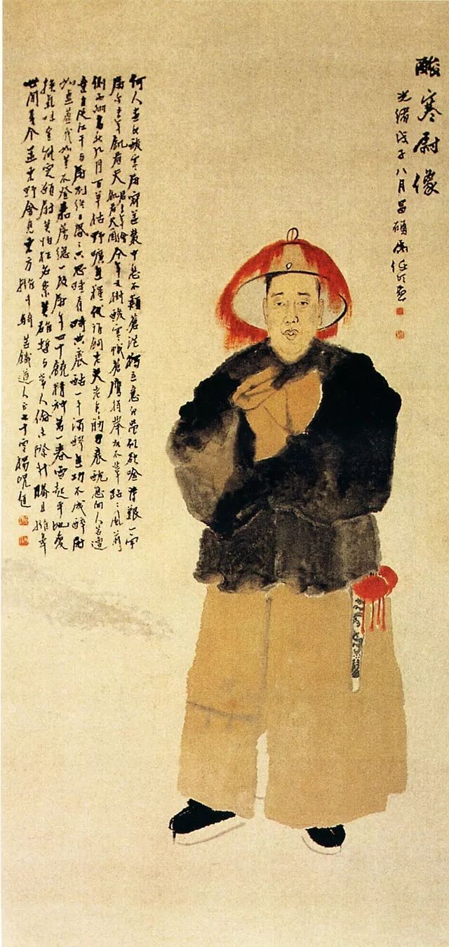 本次展览最具特色的是将吴昌硕生前照片、任伯年所作吴昌硕画像一并展出,照片中78岁的吴昌硕身着便服,面容沉静。吴昌硕真正开始关注绘画应该是从四十岁结识任伯年开始,在浙江省博物馆同样藏有一幅清代任伯年所画《酸寒尉像轴》,而画面中出现的是45岁时身着官服的吴昌硕。1904年4月,已经61岁的吴昌硕在其旧作《牡丹》题画诗中也有“酸寒一尉出无车”之句。而他著名的“一月安东令”后即辞官“决绝仕途”的故事也从侧面反映出仕途并不如意,或许因此,78岁已步入艺术盛年的吴昌硕反而从容许多。