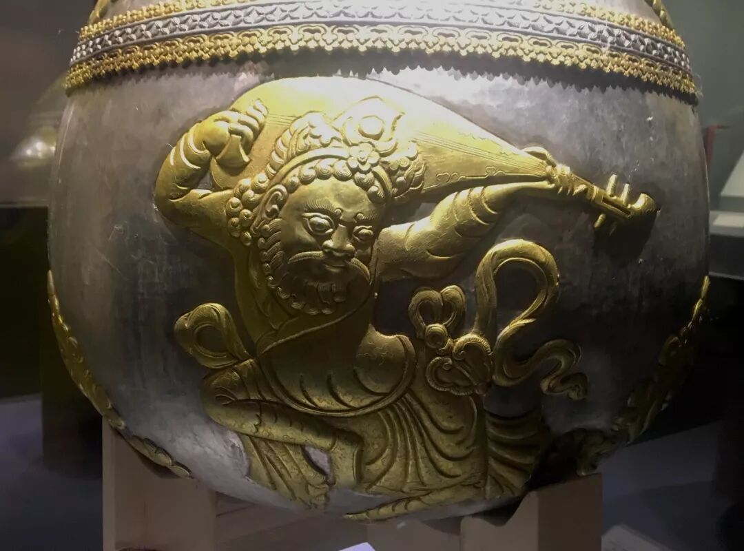 此外,供奉在拉萨大昭寺内的银壶——唐(吐蕃时期,约7世纪)兽首胡人纹鎏金银瓶(复制品)也在展览中出现。壶身錾刻有一组生动活泼的图像,单人弹琵琶和成组人像各二组。其中弹琵琶者呈“反弹琵琶”的姿态,与著名的敦煌壁画中的反弹琵琶如出一辙。另一组人像中,有一位系有“肇囊”的壮汉正在弯腰扶持一长须醉汉,另一位穿着高靿靴的青年男子屈蹲在醉汉的胯下,抱持其右足,五世达赖喇嘛在其撰写的大昭寺目录中,讲到“dnguldamrtamgoma”即马头银圣壶、系宗喀巴大师掘藏圣物。而更多的研究人员认为这是一件珍贵的吐蕃银器。