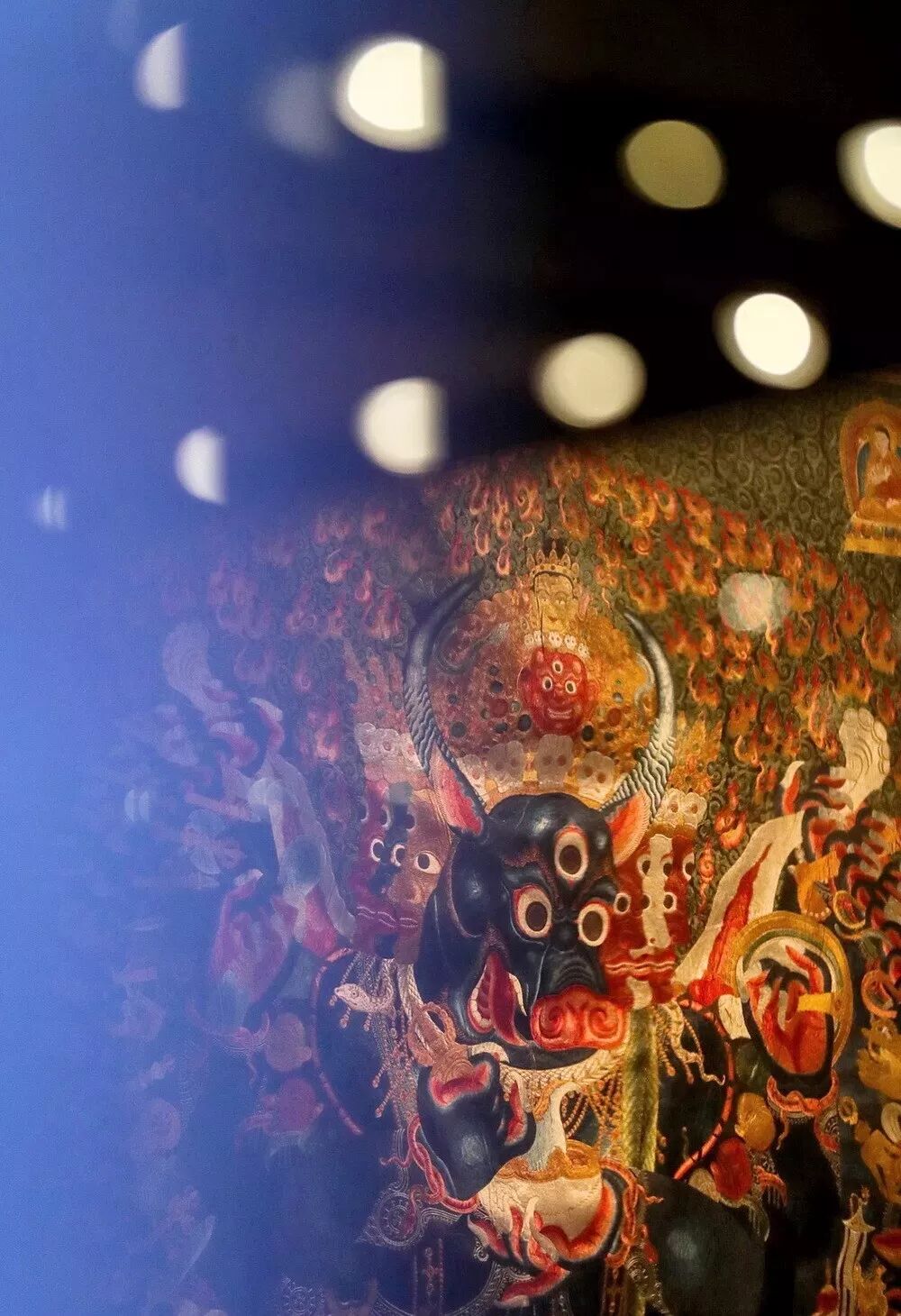 ▲ 展览现场的永乐年施刺绣大威德金刚唐卡,图片来源:TANC