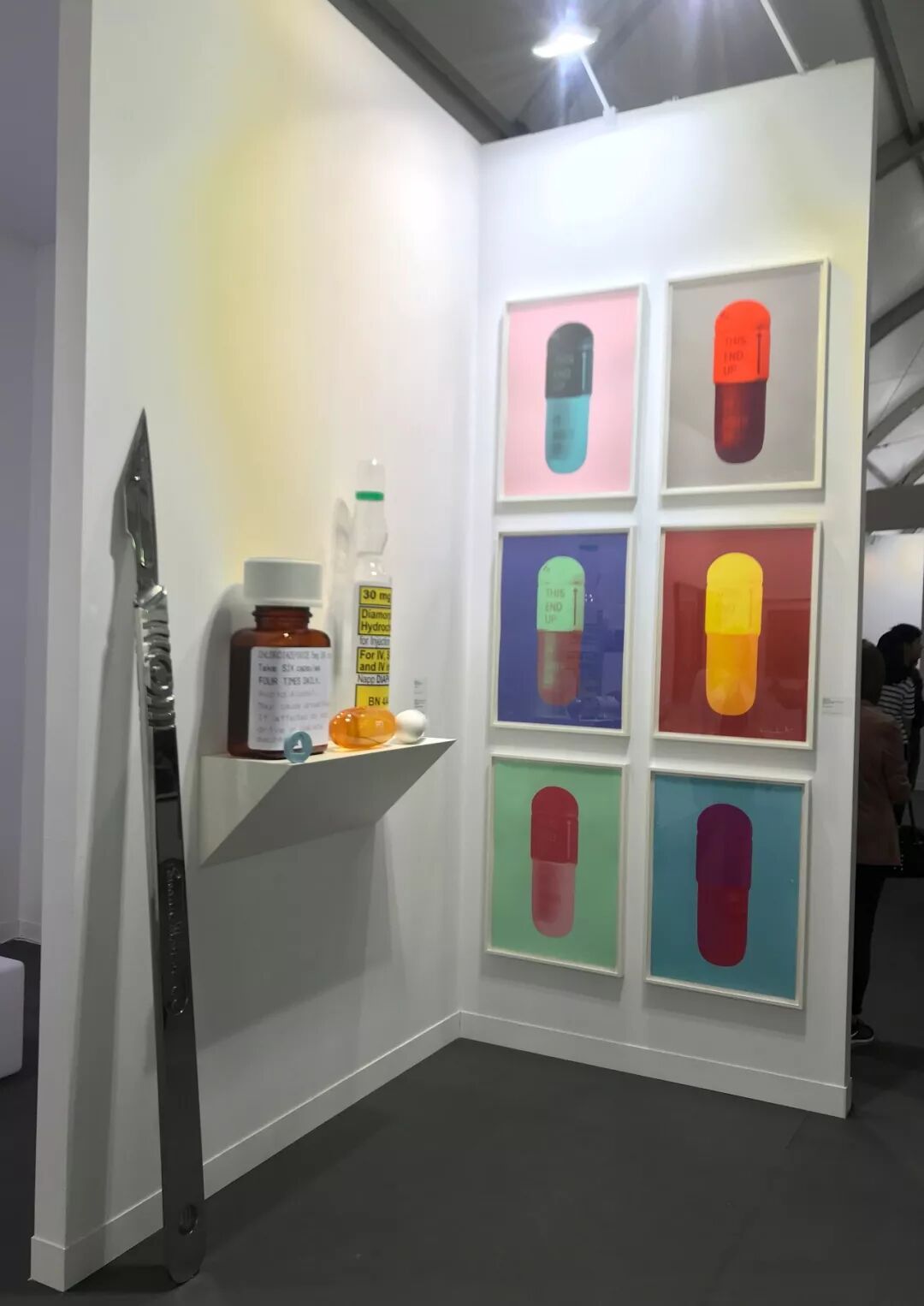 与“最强阵容”相匹配的,是更趋完善的展会策划布置。本届 Art Central 中,有不少布置亮眼的展位,引来观者围观拍照。来自伦敦的画廊 Paul Stalper Gallery 带来了艺术家 Damien Hirst 以药物制成的雕塑,来自其2014年创作的“Schizophrenogenesis”系列。作品探讨现实、医药瓶、药丸、手术刀等概念,以迷惘交错的方式呈现于观众眼前。大型多彩的糖果色装置艺术配合另外一位艺术家 Brian Eno 的灯光装置艺术,整个展位好似小型沉浸式艺术展般吸睛。被问及为何选择参加 Art Central,画廊主 Paul Stalper 向《艺术新闻》表示:“我们会参加 Art Basel Miami 和 Art Central。我明显感觉到今年的 Art Central 比之前更专业了,参展画廊也不再是拼命往墙上挂东西,而是有选择性的、更有策展理念地在展示作品。” Paul Stalper Gallery 的作品几乎都是明码标价,靠在墙上引人注目的不锈钢手术刀装置作品标价40万港元,而其药丸喷印系列作品则每幅以5.2万港元出售。