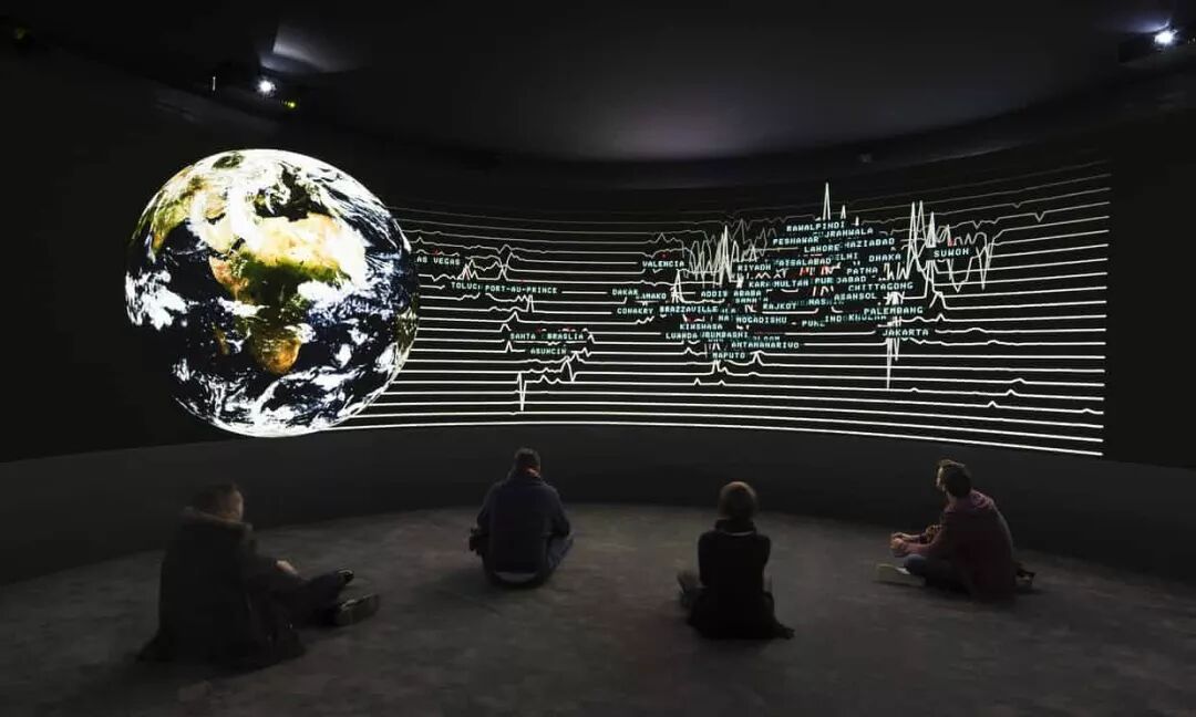其中,在巴黎东京宫(Palais de Tokyo)举办的新展览“出口(Exit)”中的一件同名大型视频装置十分引人关注,这件作品通过一系列动画、图像和文字,将气候变化所造成的人类和生态代价的数据呈现出来。其策展人埃尔维·尚戴斯(Herve Chandes)曾声称,该展览提供了一种“我们是如何与我们自己星球的毁灭联系起来的新美学”。前不久,上海当代艺术博物馆展出的“卡地亚当代艺术基金会: 陌生风景”中,《出口》也作为其中的重要部分被展出。