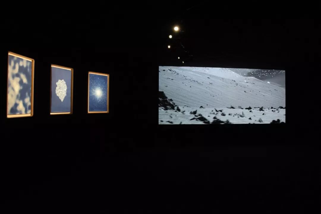 这种重塑发生在所有参展艺术家的作品中。还在为期两年的研究生课程最后阶段的雨果·德维切尔(Hugo Deverchère)带来了他在2017年创作的《万象》。德维切尔表示他对未知的事物以及宇宙一直怀有好奇心,而《万象》正是来自他与位于西班牙附近的大西洋上一个火山岛上的天文台合作的作品。该作品由一组摄影作品和一个影片共同组成,摄影源自天文台里的天文学家记录下来的图片,德维切尔再采用蓝晒法进行冲洗,每张照片都花费了将近一个月的时间进行创作。而影片的影像部分是艺术家利用天文台上用来观测宇宙深处波动的射电望远镜来拍摄的火山岛上的景观,音频部分则是将射电望远镜记录下来的宇宙数据所转化成的声音数据创作而成。