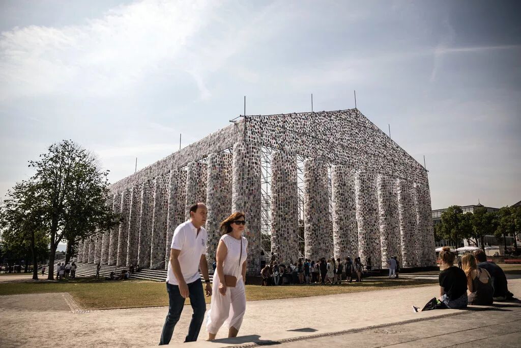 阿根廷艺术家玛塔·米努欣(Marta Minujín)的作品《书之帕特农神庙》(The Parthenon of Books),在第14届文献展上于两座城市展出,这一举动将不再沿用。图片来源:《纽约时报》