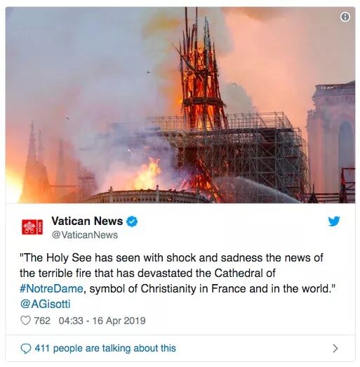 梵蒂冈发表推文,称巴黎圣母院为“法国和世界的基督教象征”,图片来源:Twitter