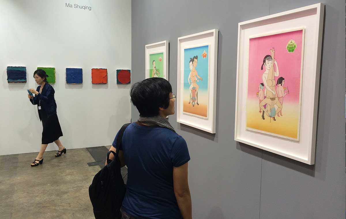 Osage 画廊展位,观众正在欣赏香港艺术家石家豪的作品